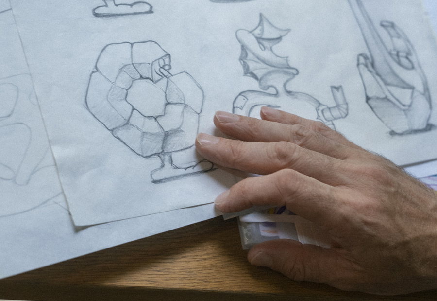 本作品は、自然界に多く見られる六角形を基調とし、イモムシのような姿の両端がつながり、無限を象徴した輪となっています。六角形は雪の結晶や昆虫の複眼、蜂の巣、土星の北極など、極小から惑星規模まで現れる自然の形です。途切れない輪は自然界の循環も象徴し、向かい合う二つの顔は同時に存在する異なる感情を示唆しています。